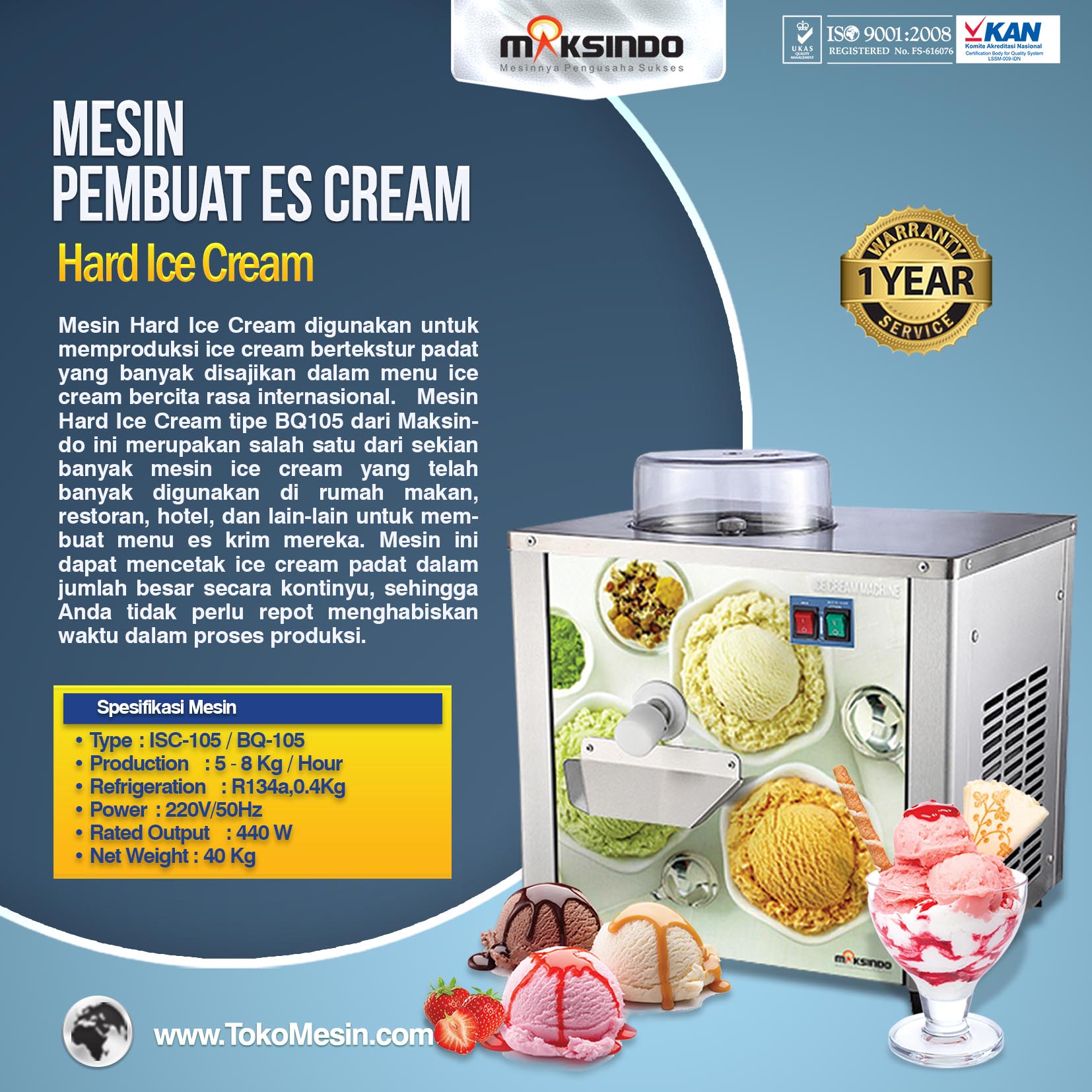 Spesifikasi mesin es krim ini :