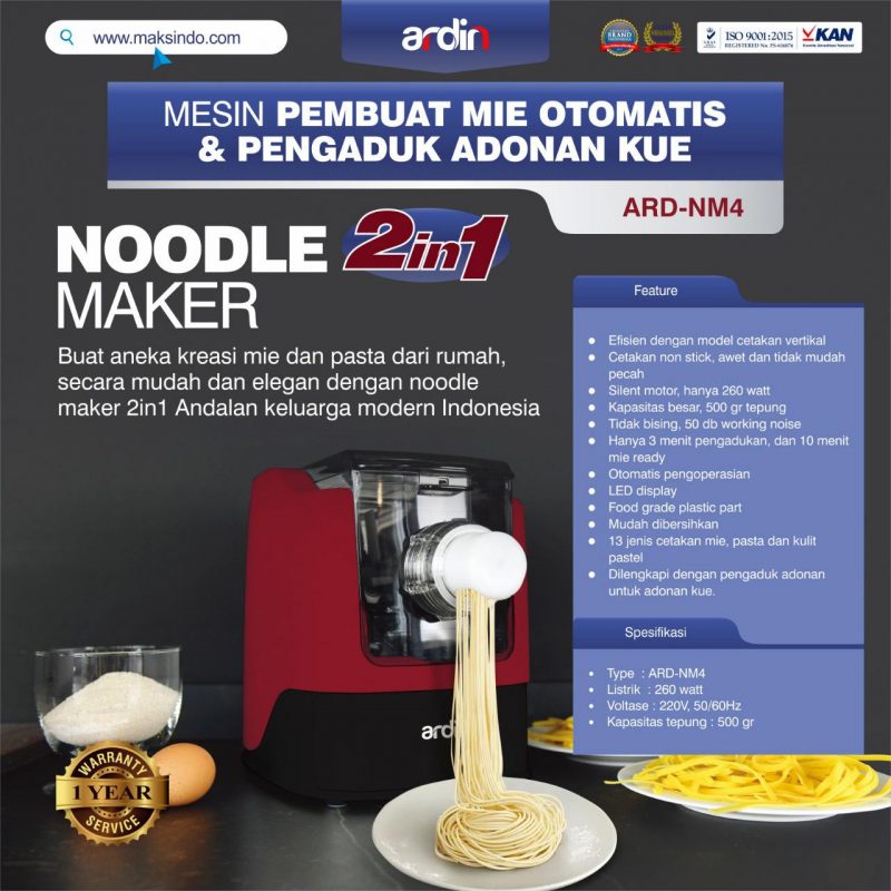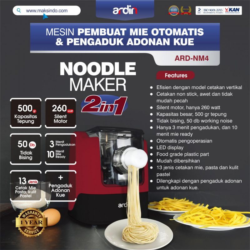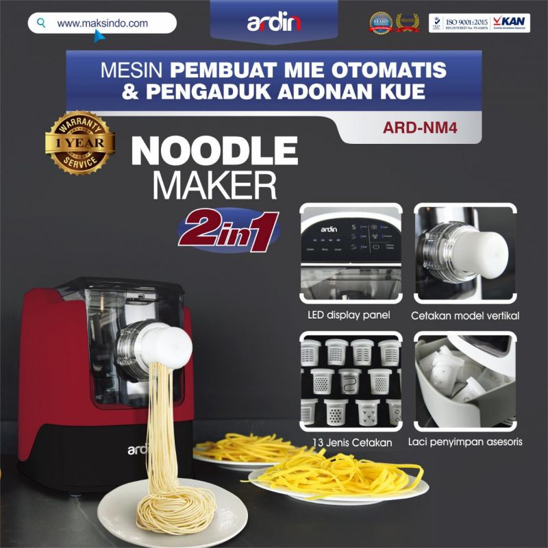 Mau membuat mie dengan cepat tanpa ribet ? Dengan mesin pembuat mie otomatis Noodle Maker 2in1 ARD-NM4 Ardin, Anda bisa membuat mie aneka bentuk dengan cepat. Hanya 10 menit sudah tercetak dan siap dimasak. Jika Anda biasanya menggunakan cetakan mie model lainnnya, yang butuh proses lama, maka dengan mesin mie ini, Anda bisa melakukannya dengan mudah.
