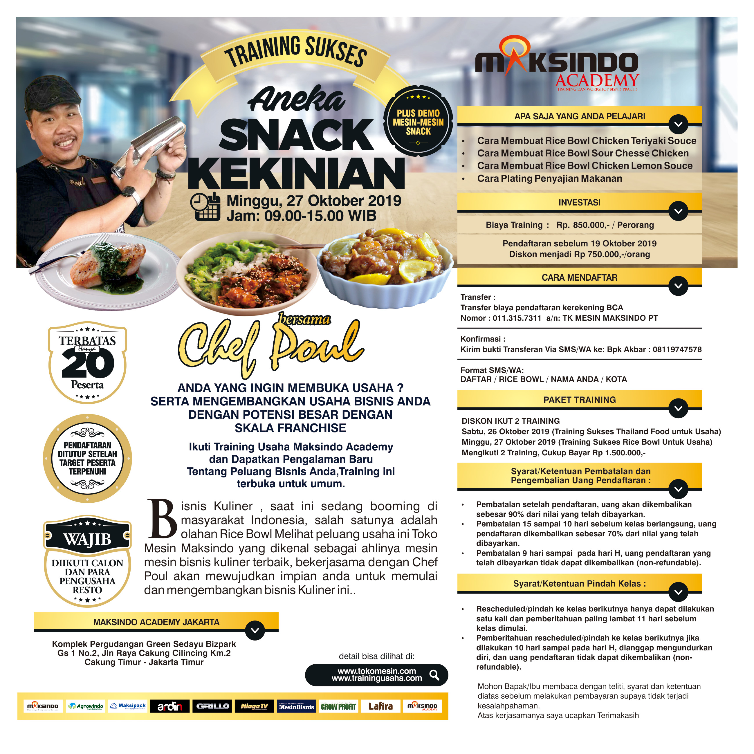 Anda yang ingin membuka usaha ?Serta mengembangkan Usaha bisnis Anda dengan potensi besar dengan skala Franchise ikuti Training Usaha Maksindo Academy danDapatkan Pengalaman Baru Tentang Peluang Bisnis Anda, Training ini terbuka untuk umum.Bisnis Kuliner , saat ini sedang booming di masyarakat Indonesia, salah satunya