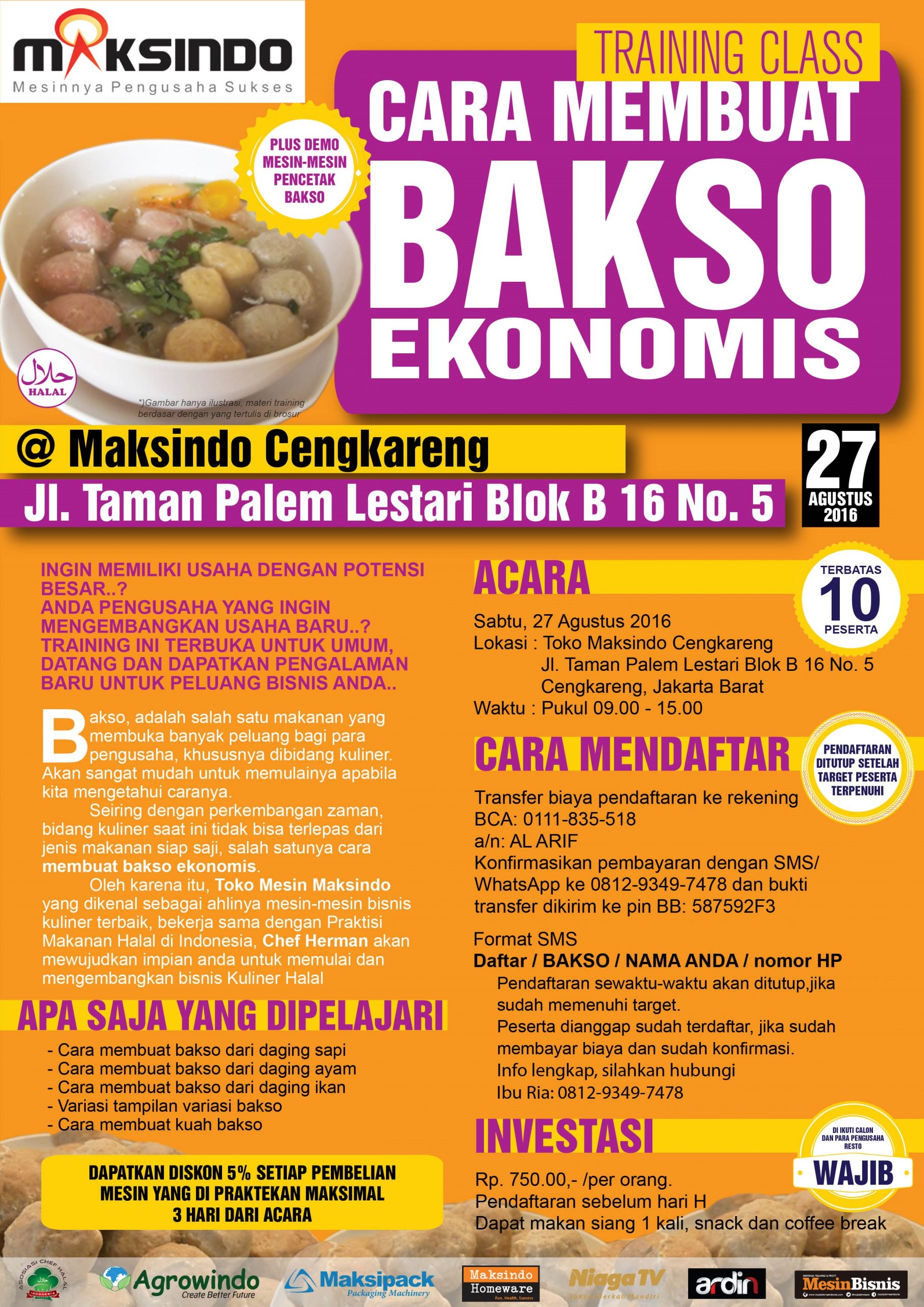 Bakso, adalah salah satu makanan yang membuka banyak peluang bagi para pengusaha, khususnya dibidang kuliner. Akan sangat mudah untuk memulainya apabila kita mengetahui caranya. Seiring dengan perkembangan zaman, bidang kuliner saat ini tidak bisa terlepas dari jenis makanan siap saji, salah satunya cara membuat bakso ekonomis. Oleh karena itu, Toko Mesin Maksindo yang dikenal sebagai ahlinya mesin-mesin bisnis kuliner terbaik, bekerjasama dengan Praktisi Makanan Halal di Indonesia, Chef Herman akan mewujudkan impian anda untuk memulai dan mengembangkan bisnis Kuliner Halal.