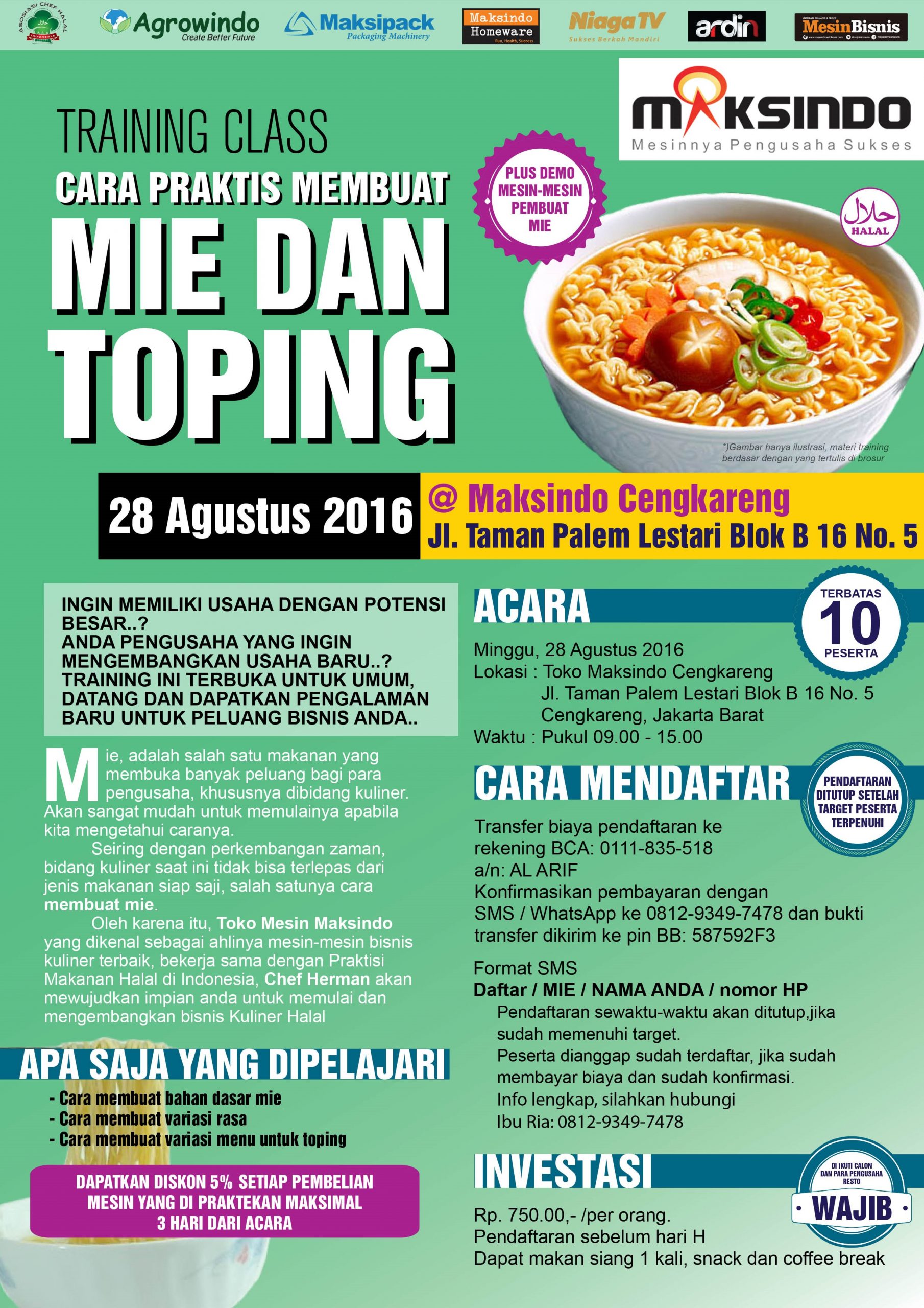 Training Usaha Mie dan Toping di Cengkareng 28 Agustus 2016 chusnul July 20, 2016 Even Terbaru Related posts:Training Usaha Dimsum Dan Siomay, 2 September 2018Training Usaha Mie dan Toping, 15 Juli 2018Training Sukses Steak Bintang 5 Harga Kaki 5, Minggu, 13 Juli 2019 Training Usaha Mie dan Toping di Cengkareng 28 Agustus 2016